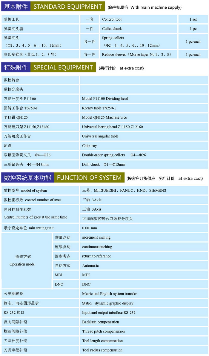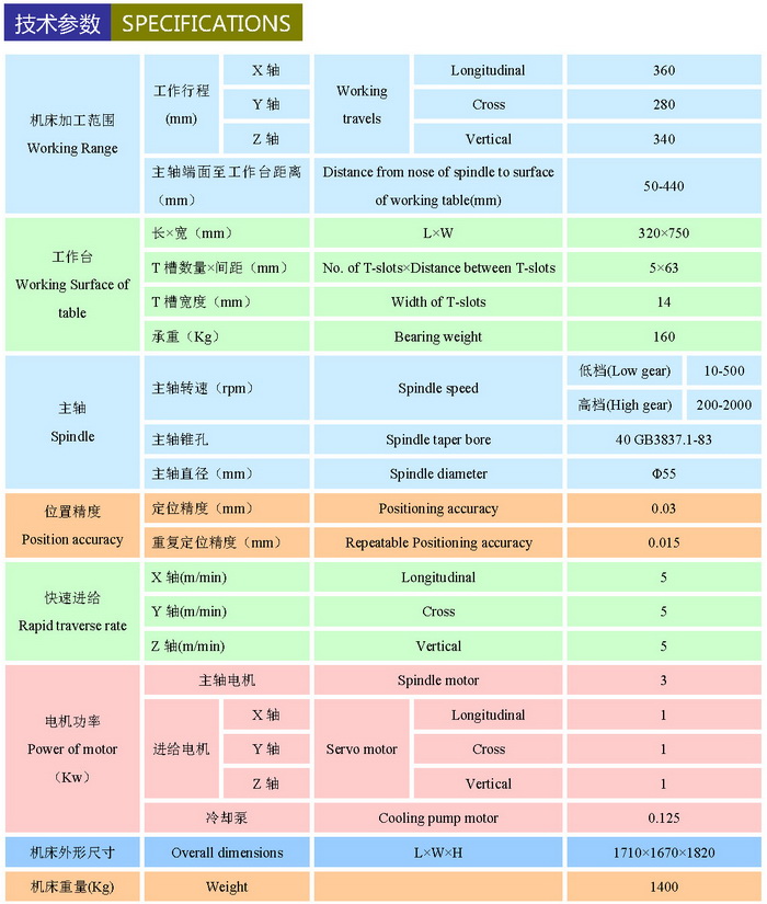 本機(jī)床采用優(yōu)質(zhì)鑄件,鑄件結(jié)構(gòu)合理。長導(dǎo)軌加入耐磨合金元素,耐磨性更高;短導(dǎo)軌采用貼塑導(dǎo)軌,摩擦系數(shù)小,運(yùn)動(dòng)靈活,使用壽命長。X、Y、Z三方向進(jìn)給運(yùn)動(dòng)均采用滾珠絲杠,運(yùn)動(dòng)更精確。主軸為變頻無極調(diào)速控制方式,采用國產(chǎn)銑床專用變頻主軸電機(jī)及進(jìn)口變頻器。主軸分為高檔、低檔,兩檔速控制,低檔時(shí)最大扭矩可達(dá)160Nm。該機(jī)床有立、臥兩主軸,配合數(shù)控轉(zhuǎn)臺(tái)及特殊附件可使其加工范圍更廣。潤滑系統(tǒng)為自動(dòng)潤滑,使機(jī)床導(dǎo)軌、絲杠、軸承潤滑更充分,提高機(jī)床壽命,提高精度及穩(wěn)定性。XK8132數(shù)控萬能工具銑床主軸可依客戶需要配置告訴銑削用電主軸,該主軸具有高精度、高轉(zhuǎn)速、振動(dòng)噪聲低等優(yōu)良特性。