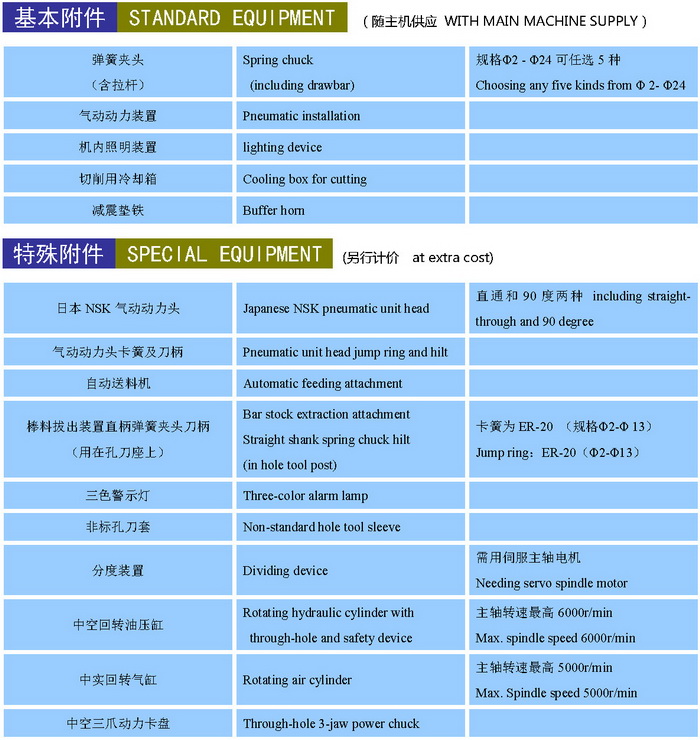 機(jī)床可選伺服主軸電機(jī)配置,能實(shí)現(xiàn)工件的分度、鎖緊等功能。另外機(jī)床可配置氣動(dòng)動(dòng)力頭(或電主軸),實(shí)現(xiàn)工件的鉆孔、銑槽及銑方等加工功能,有效的提高機(jī)床加工效率。